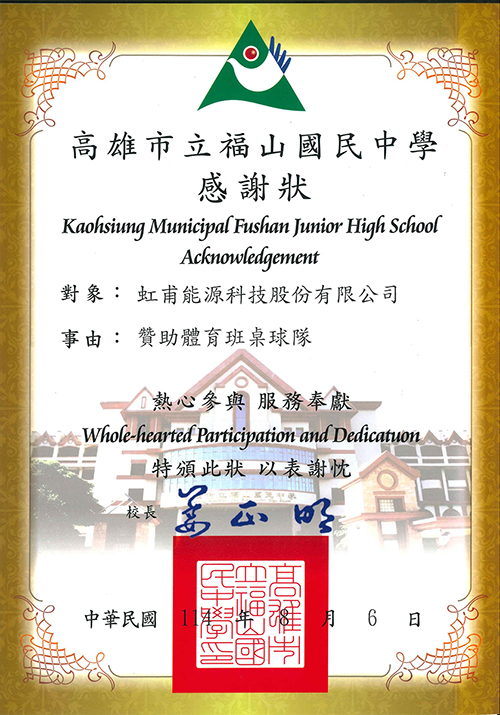 本公司秉持回饋社會、支持青少年體育發展的理念,積極承擔企業社會責任,並於本年度贊助「高雄市立福山國中」-桌球隊,協助該隊在訓練器材與比賽參與上獲得更多資源。今日,本公司欣然收到由福山國中頒發的感謝狀,以表達對我司支持的肯定與謝意。